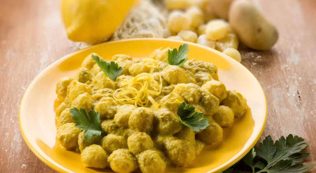 Originating from the Amalfi Coast, this recipe incorporates the prized Sfuasto lemon. The plump potato-based dumplings are made from potatoes, flour, and egg, and are boiled, then tossed in a zesty lemon sauce.