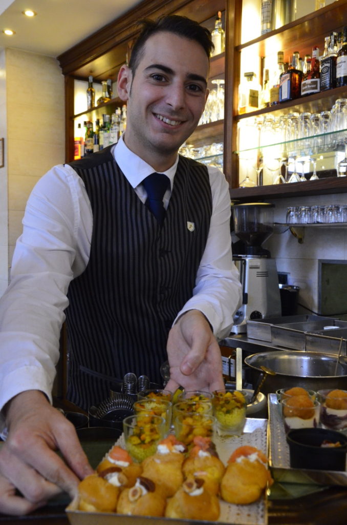 Continue to Via Drapperie, marked by stacks of salami and pendulums of Prosciutto. Fruit and vegetable markets and stalls brim with everything in season from purple-fringed artichokes to arugula, truffles in season, pomegranates, orange zucchini flowers, mushrooms, Susine plums, San Marzano tomatoes, mounds of white and red grapes, chestnuts, red chili pepper, and garlic, vendors shout out their daily specials.