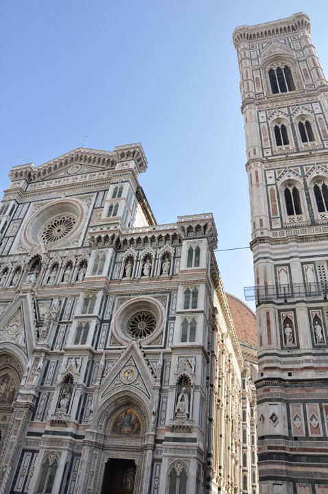 - Duomo, the distinctive icon in Florence’s skyline is the dome of the cathedral, Santa Maria del Fiore. The building is located due north of the Piazza della Signoria, was begun by the sculptor Arnolfo di Cambio in 1296. Numerous local artists continued to work on it during the following century and a half. The painter Giotto designed its sturdy bell tower (campanile) in 1334. The Duomo’s octagonal cupola (1420-36) which dominates the city was the creation of Filippo Brunelleschi, master architect and sculptor.