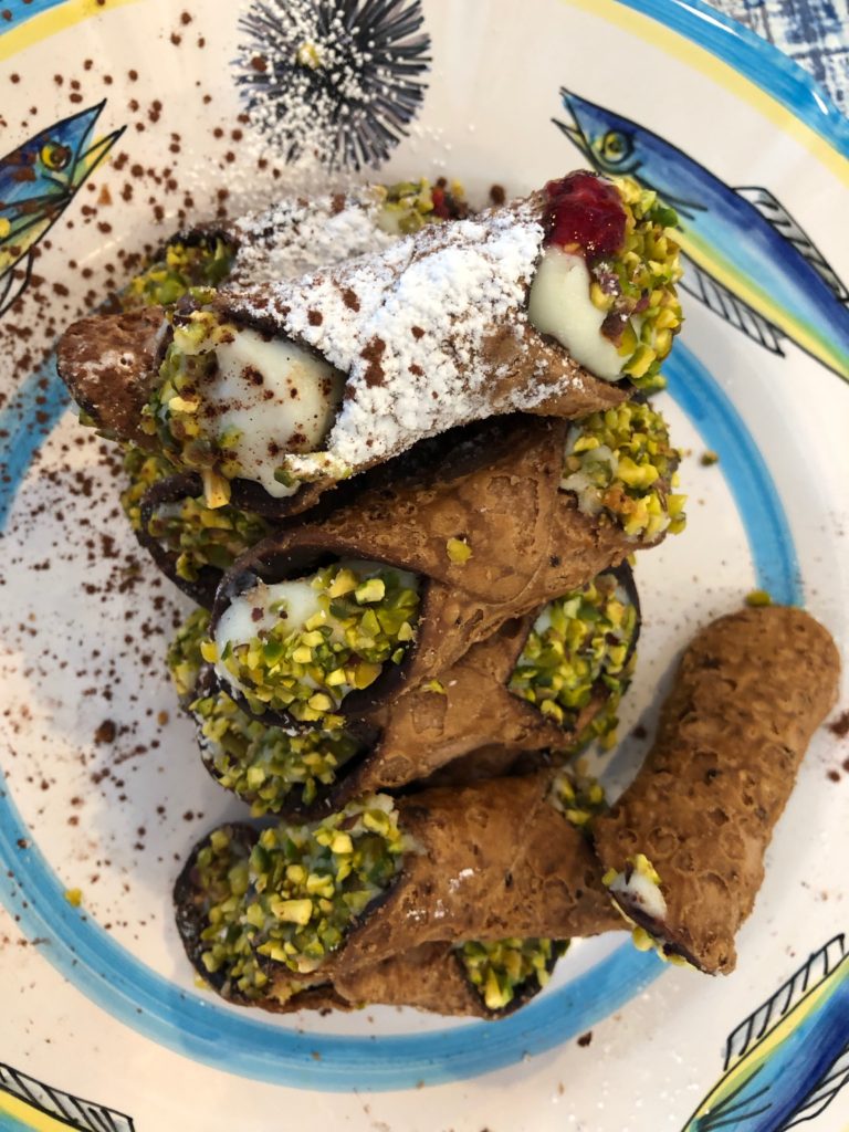 Classes are held in a professional lead by Executive Chef David. Sicilian menus include local fare using farm-to-table ingredients. Start with eggplant – and learn how to transform it into grilled, stuffed, rolled with herbs and fresh ricotta. Red peppers are also a tradition – stuffed and grilled. Fresh cavatelli, local homemade pasta served with a sugo di maiale, pork and tomato sauce, along with pasta con i ceci, pasta with chickpeas or scacce, Sicilian baked dish, and pastizza, savory broccoli pie. Desserts include cassata, a traditional cake with citrus fruit and cannoli! Following the cooking class, everyone enjoys the food that was prepared in the class.
